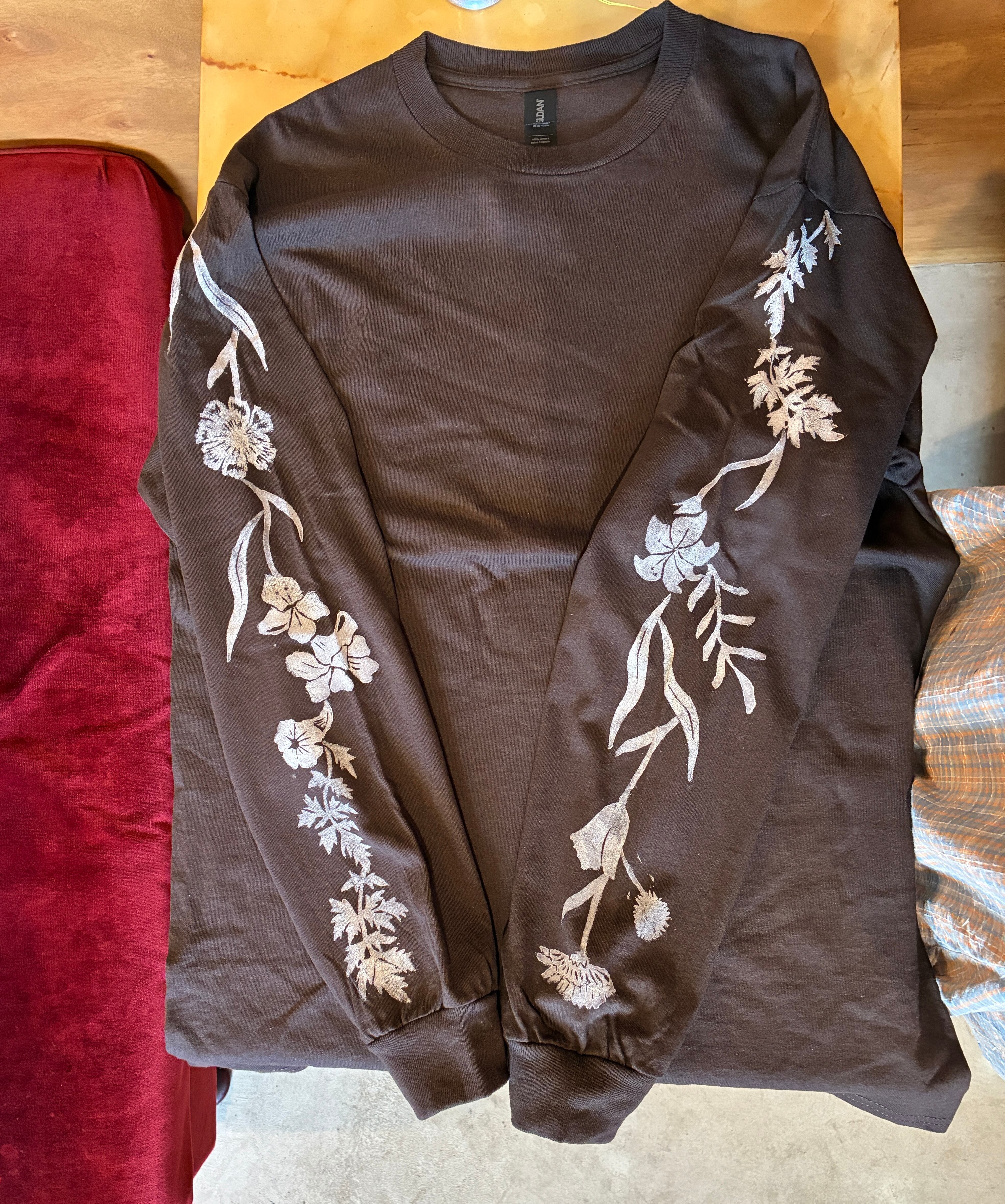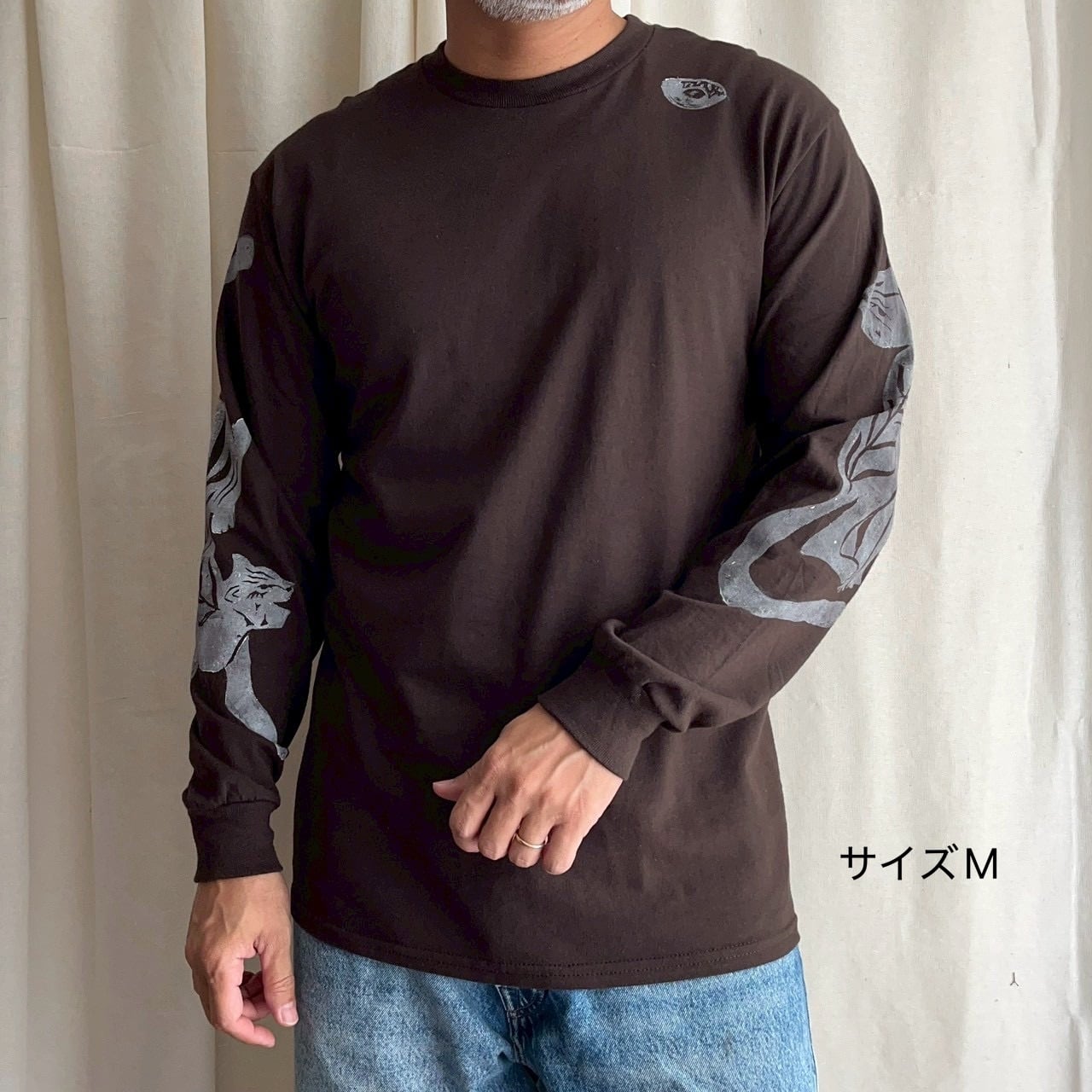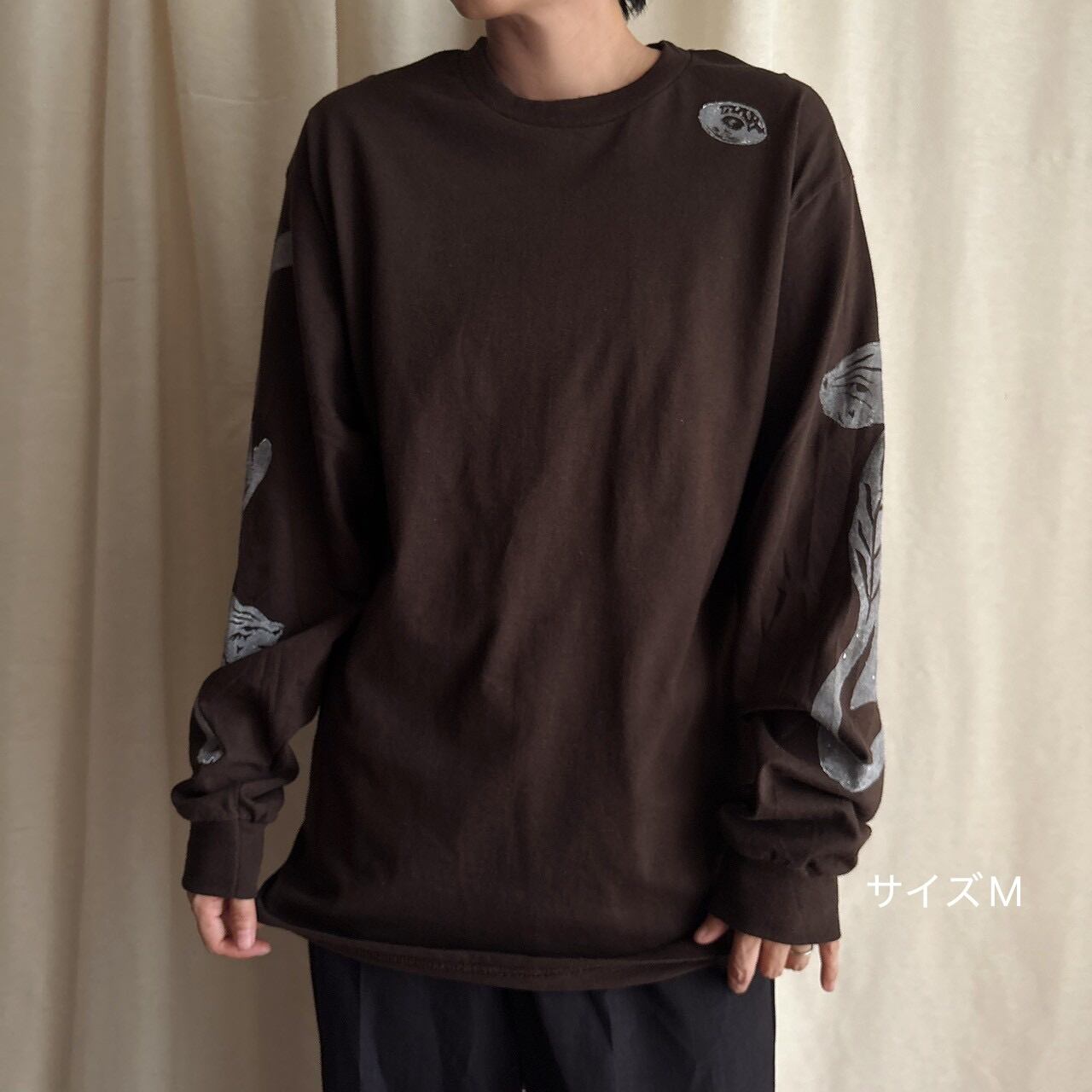 mui okinawaブロックプリント『ガジュマルになりたい野草』長袖Tシャツ ダークブラウン